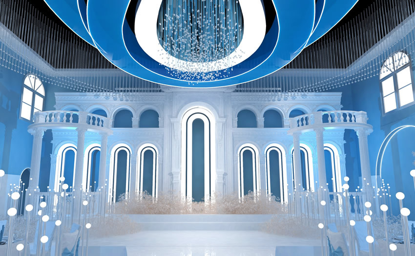 婚礼堂设计是一种专门用于举办婚礼和其他相关活动的室内设计。以下是一些关于婚礼堂设计的建议: